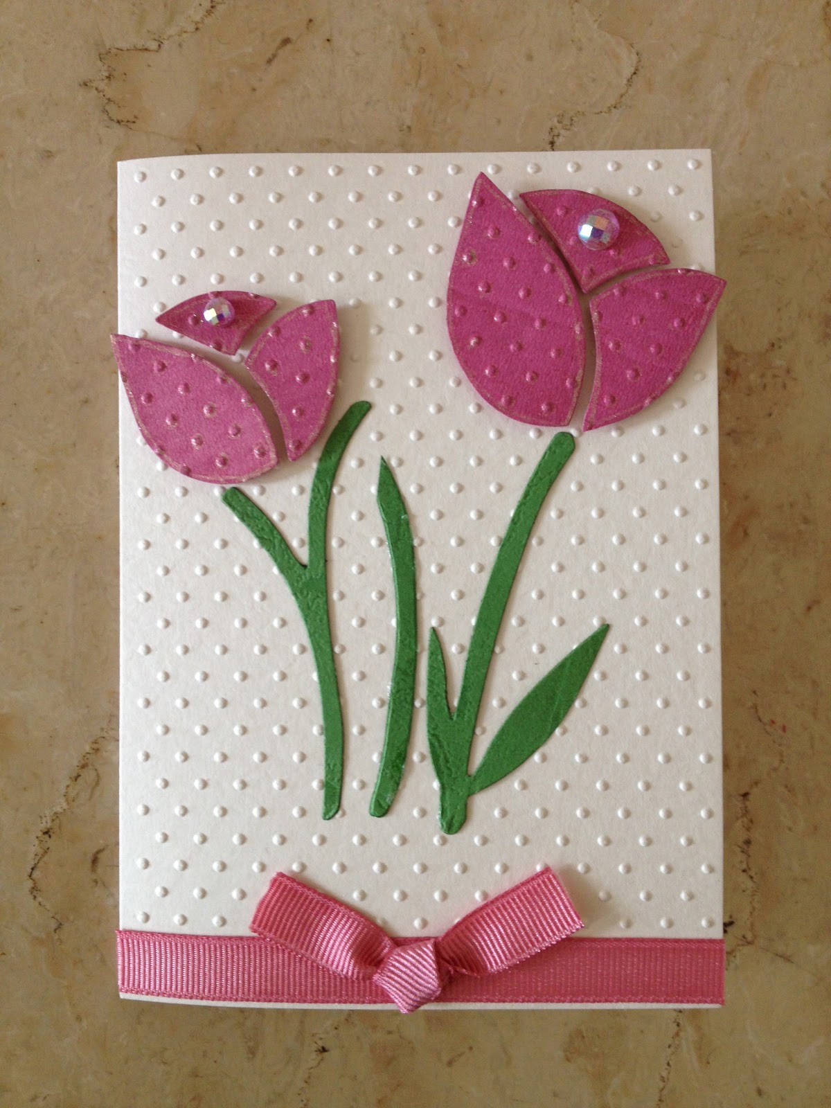 I have been invited to a baby shower this week so here is a quick card I put together in like 8 minutes - with a printed ribbon, dry embossing, teeny weeny bit of stamping (Hampton Art stamp) and a ready made bow.